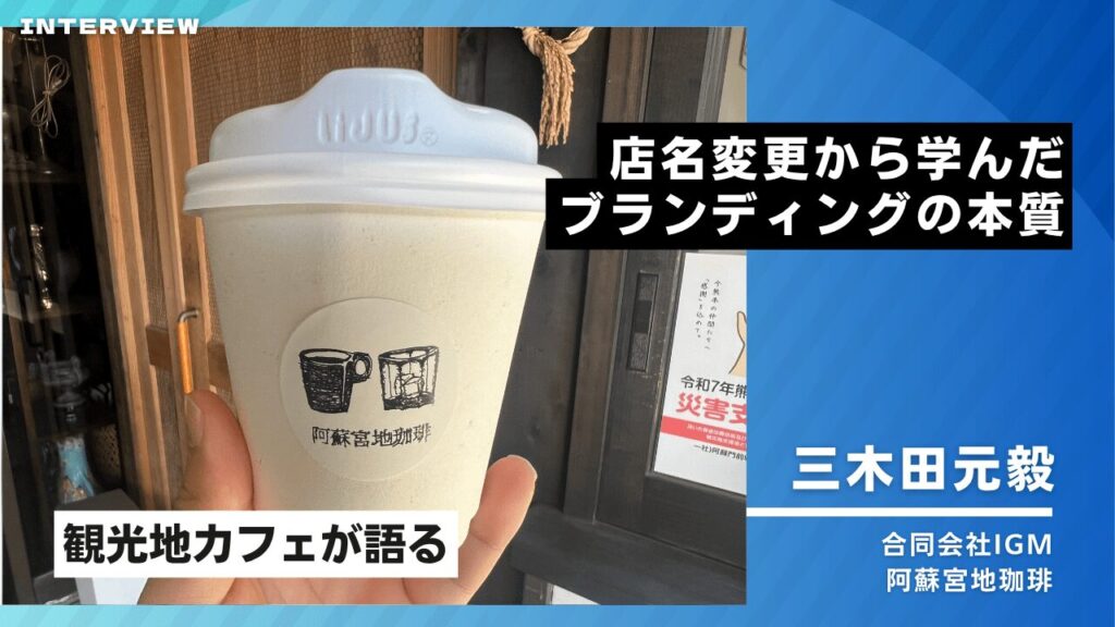 阿蘇神社近くでコーヒースタンド「阿蘇宮地珈琲」を経営する三木田元毅さん。 飲食業未経験から低予算でカフェを開業し、観光地という立地を活かして順調に経営を続けている。 しかし、その道のりには「店名変更」という大きな決断があった。 今回は、カフ... -